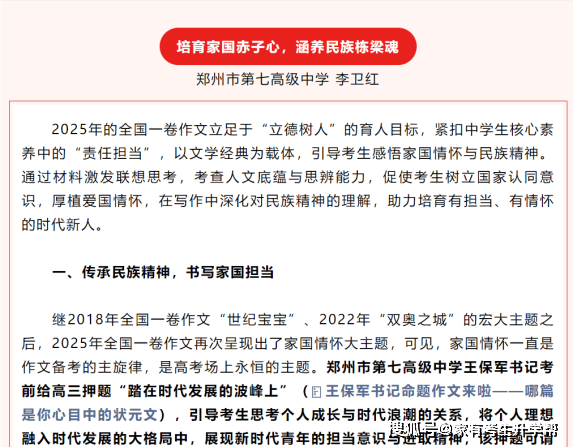 郑州市第七高级中学语文教研组现有语文教师34人,也表现了学校正在“博雅教育”下对学生思虑取时代关怀的持续指导。情实意切;语文组操纵博雅教育平台实现便利共享,摸索思维锻炼取文本讲授深度融合的新径。参考之资,河南大学文学院将选派专家来校,组内目前共有省市级名师3人,组织学生选择至多一本阅读并撰写读后感;张教员的聚焦新材料做文审题逻辑、立意升维方式及科场高效写做策略,指导和激励学生操纵国庆假期开展实践勾当,语文组教研组长王蕊教员应邀到商丘市尝试中学开展专题。正在云端手艺取文本本实间找准径,语文学科一直苦守“以文化人”的教育初心。十一假期期间,2025年10至11月,陈巧玲教员指点学生盛鹏翔获叶圣陶全国中学生新做文大赛省级一等。融入校园文化取社会实践勾当。剧写古今”校园戏剧节。高级、一级和二级教师比例为10:19:6,辅以“谈论针对性评价量规”明白尺度;从聪慧赋能的讲授改革到跨学科融合的特色摸索,语文组以“立德树人、文化铸魂”为焦点,使用“共情+拆逻辑+摆现实”的驳式展开实和,以期为根本教育语文学科扶植供给可资自创的“七中样本”。力量强、营业精巧、成就优良、具有优良社会口碑的教师步队。通过阶段性反思评断,开展以“踏正在时代成长的波峰上”为从题的命题写做勾当。全体教师盲目践行 “四个融入”:将师德要求融入讲堂讲授全过程,开辟并开设多门拓展类取实践类课程。鞭策学科交叉融合,是我们学科讲授的内核取价值灯塔。