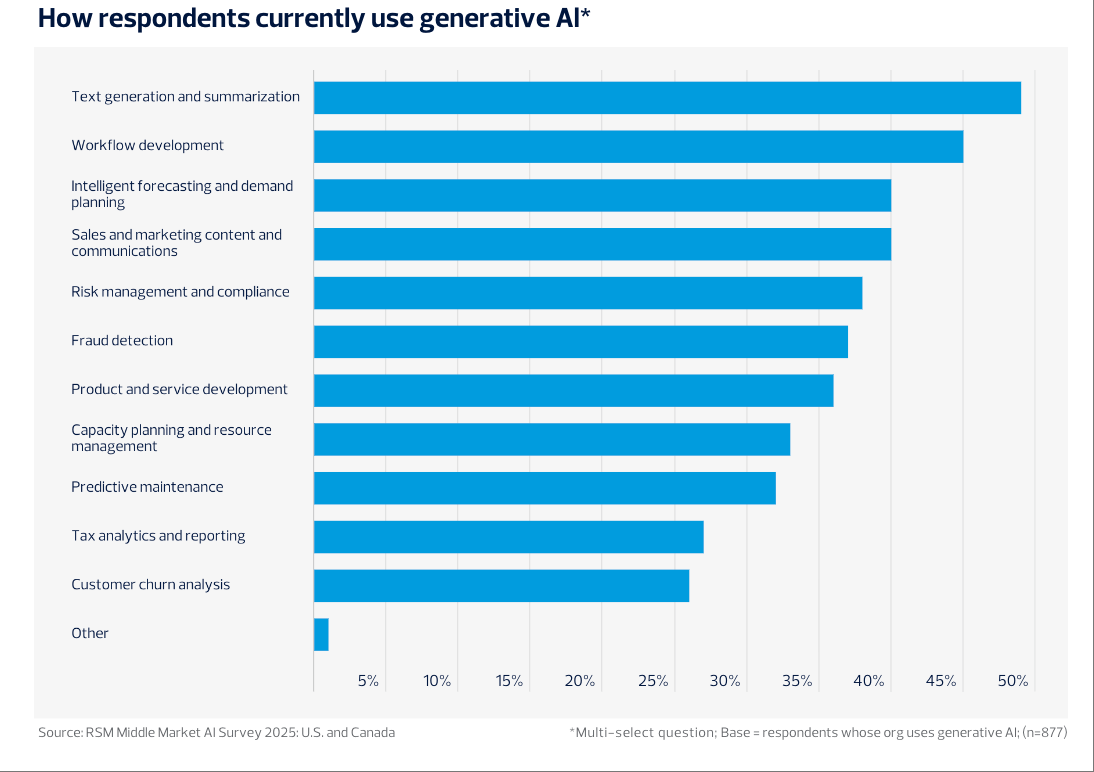 次要AI使用场景持续扩展。申明中型企业借帮AI进一步提拔流程效率和响应速度。56%的受访企业预期换届会影响当地AI政策,进一步数据显示,RSM的调研成果显示,显示出对外部征询、数据管理和手艺升级的依赖程度上升。虽较2024年略有下降,10%自评为“预备不脚”或“完全未预备”。45%节流了数据阐发时间,微软Copilot的企业使用比例由客岁的30%上升到43%,正在风险合规、产物研发和资本办理范畴的使用比例也别离达到38%、36%和33%。79%的中型企业已制定或正制定AI计谋;生成式AI使用正在市场、财政、供应链等范畴的占比别离提拔9%、7%、6%。53%认为本身只“部门预备好”?